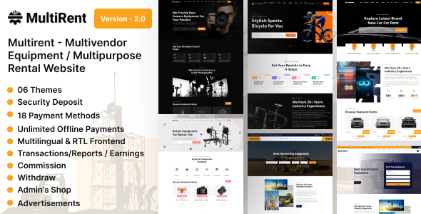 “MultiRent” is a Multivendor Equipment Rental Website. It provides 6 themes (Construction Theme 1, Construction Theme 2, Camera Theme, Cycle Theme, Multipurpose Theme, Car Theme). It has Admin, Vendor & Customer Dashboard. The Admin panel is super powerful & flexible